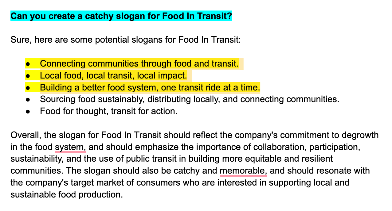 The public transit ticket 🎟️ connection was the main out-of-box, novel idea that the AI gave me, and I think something that doesn’t really exist out there yet. But it might actually be a very cool business model using a public transit ticket as access to certain sustainable or degrowth services in a city (see long-term business strategy below). Lots of win-wins in there for the different stakeholder.