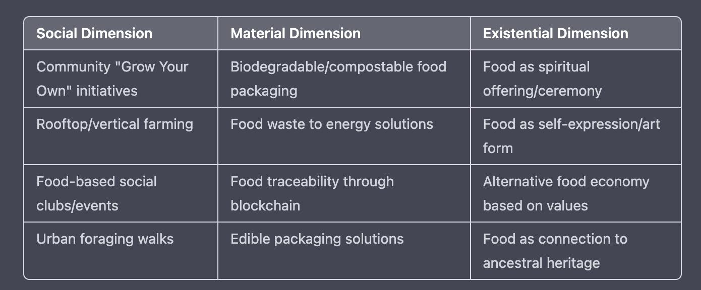 What’s interesting to me is that the ideas above don’t really mention any of the big topics that the food industry has been investing in or is currently focusing on. For example: convenience (food delivery, fast food, ghost kitchens), self-improvement (functional foods, frozen foods, instant food), and automation (QR codes, kitchen robots). Which, in my opinion, would again create the context for alienation and aggression rather than resonance.