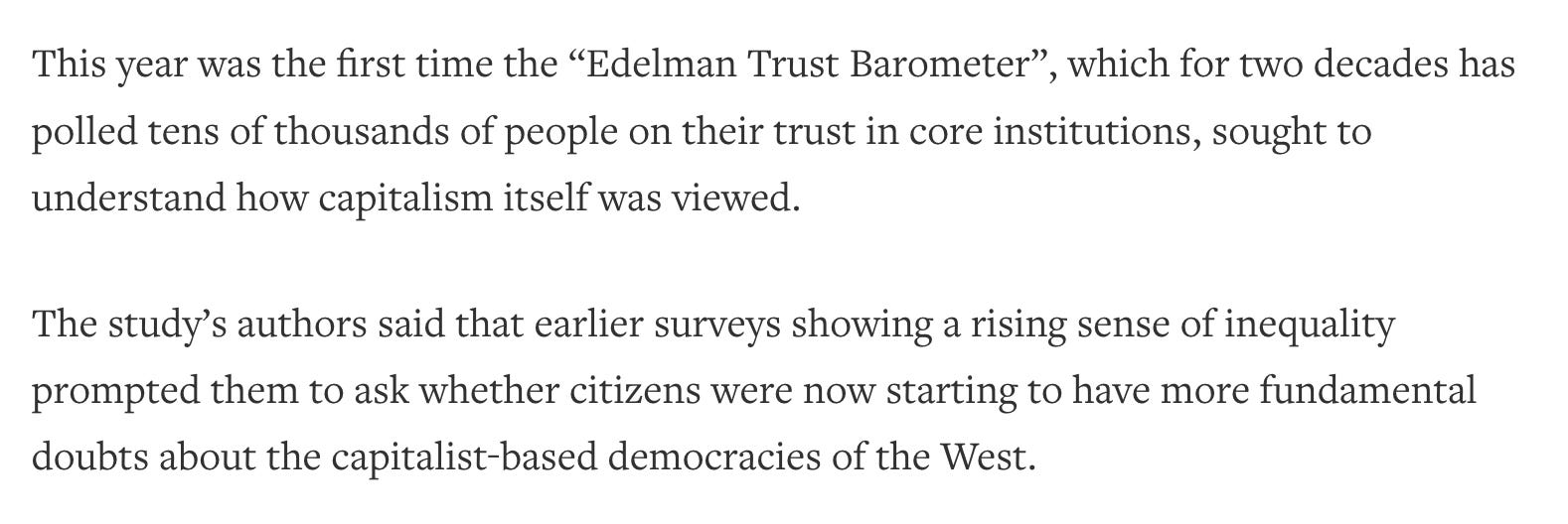 Now, I have to confess that I view stats (particularly polls) very critically. A good researcher can find stats to support almost any theory or opinion. However, I am not saying that the numbers above are meaningless. No, they are definitely valuable and show an interesting trend here. But what’s even more fascinating to me is that these studies are done in the first place. On a meta level, it’s interesting to see that these anti-capitalist questions are asked more frequently. For example, Edelman only started asking the above question for its yearly Trust Barometer two years ago, in 2020.